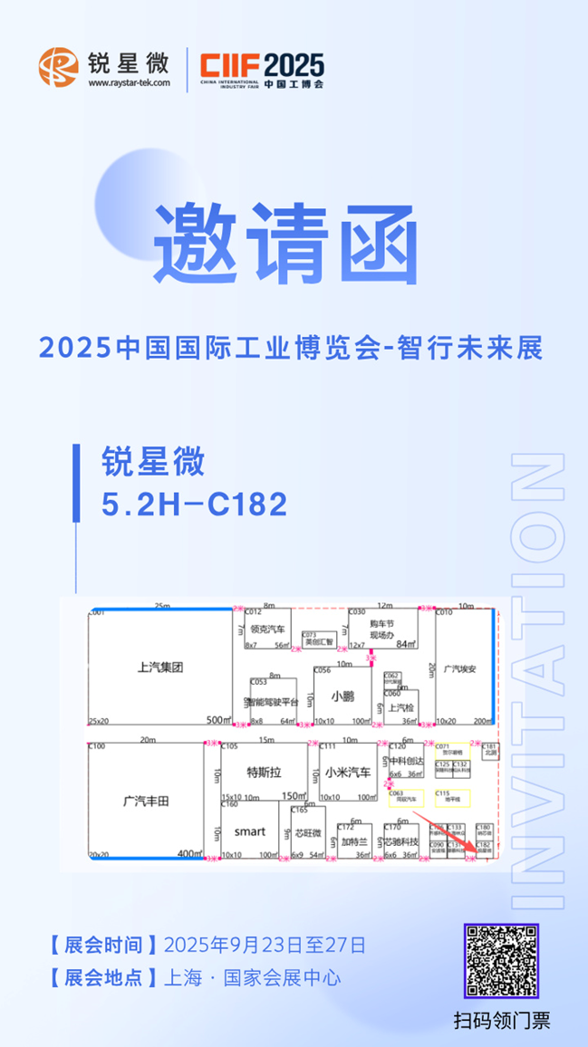 2025年9月23日至27日上海·国家会展中心(上海市青浦区崧泽大道333号),锐星微将参展中国国际工业博览会——智行未来展展位号为5.2H-C182,携手行业伙伴共探汽车电子前沿技术,展示多款符合车规级标准的高可靠性芯片产品,为智能出行注入强劲“芯”动力!